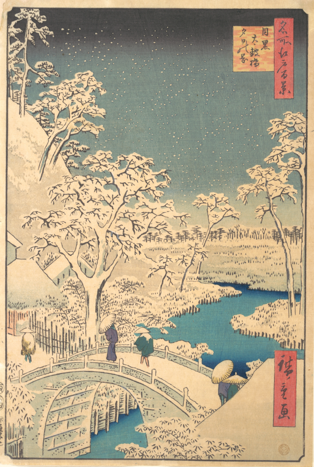 Utagawa Hiroshige (1797–1858) titled “Taiko Bridge, Meguro, on a Snowy Evening.”